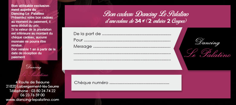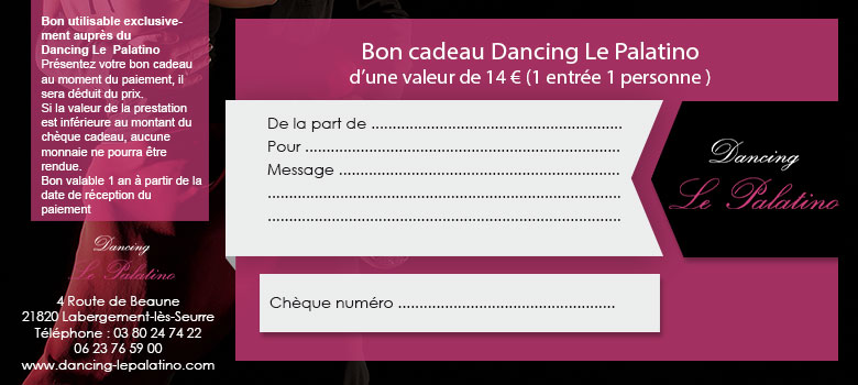 Ce chèque est à valable un an à compter de la réception du chèque par la poste, uniquement dans l’établissement Dancing Le Palatino, situé 4, Route de Beaune à Labergement-lès-Seurre (21820 – Côte d’Or).